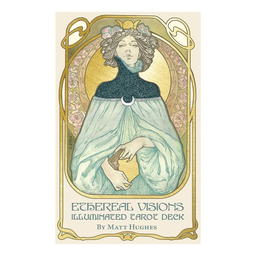 Ethereal Visions es uno de los mazos más bellos que puedas encontrar. El diseño de sus cartas está inspirado en el Art Nouveau y su creador Matt Hughes es un artista de renombre y dentro de sus creaciones este mazo de tarot destaca por sus detalles dorados en cada arcano. Incluye dos arcanos mayores extras logrando un total de 80 cartas.