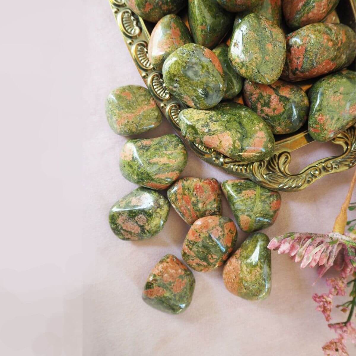 La unakita es una roca metamórfica de origen granítico, compuesta principalmente por ortosa rosa, epidota verde y cuarzo incoloro. Su nombre proviene de las montañas Unaka, en Estados Unidos, donde fue descubierta. Se caracteriza por su patrón moteado o jaspeado en tonos verdes y rosas. Además de sus propiedades físicas, se le atribuyen diversos beneficios en litoterapia, como la protección, el equilibrio emocional y la ayuda en la liberación de bloqueos emocionales. Se vincula con el chakra del corazón y el tercer chakra (plexo solar), por lo mismo ayuda a perdonar tanto a otros como a ti mismo, retirando el resentimiento y la culpa, liberándote de energía tóxica que pueda estar contaminando tu vida.